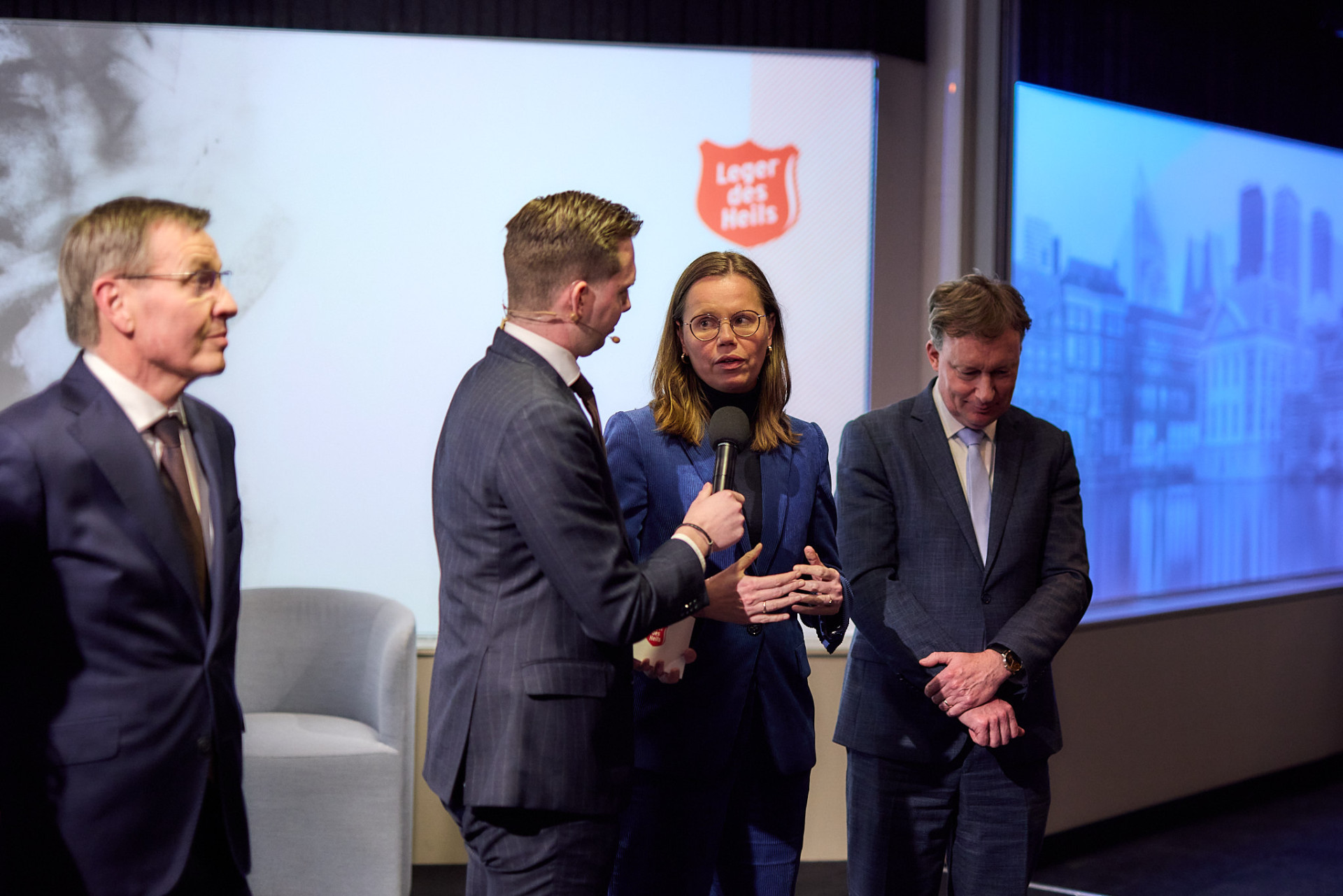 Tijdens de bijeenkomst gingen deskundigen met elkaar in gesprek. Auteur en socioloog Karlijn Roex, politiechef Noord-Nederland Martin Sitalsing, burgemeester van Ede René Verhulst en Tara Jane Thomas, adviseur ggz Leger des Heils deelden hun ervaringen.